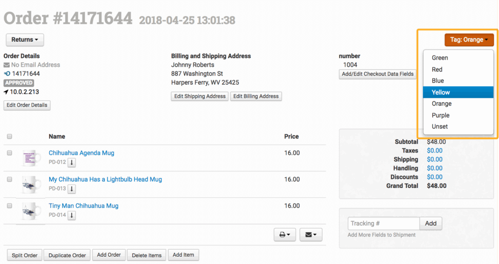 Tags come in six colors: green, red, blue, yellow, orange and purple. Red is sometimes used to tag fraud risk orders and green to tag orders that are waiting for action to be taken on them, however you can decide what the colors mean and how to apply them within your own store.