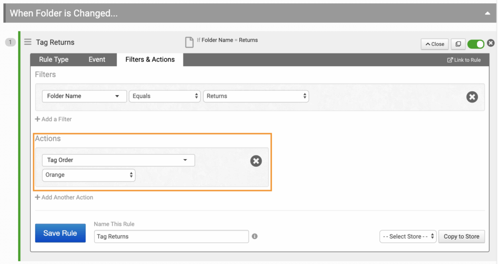 When you handle a return, move the order into the Returns folder. Keep in mind that the folder is only a label. If you need to take any actions on the orders when it is moved into the Returns folder, you will either need a rule to tell Order Desk what to do or you will have to manually act on the order. If you are unfamiliar with the Rule Builder, see the How to Work with Rules guide.