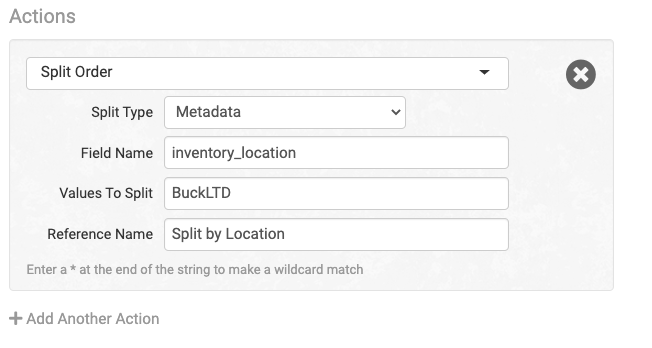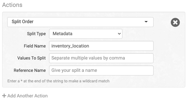 Under the Filters & Actions tabs, select the Split Order action. Choose Metadata as the Split Type, set the Field Name as inventory_location,