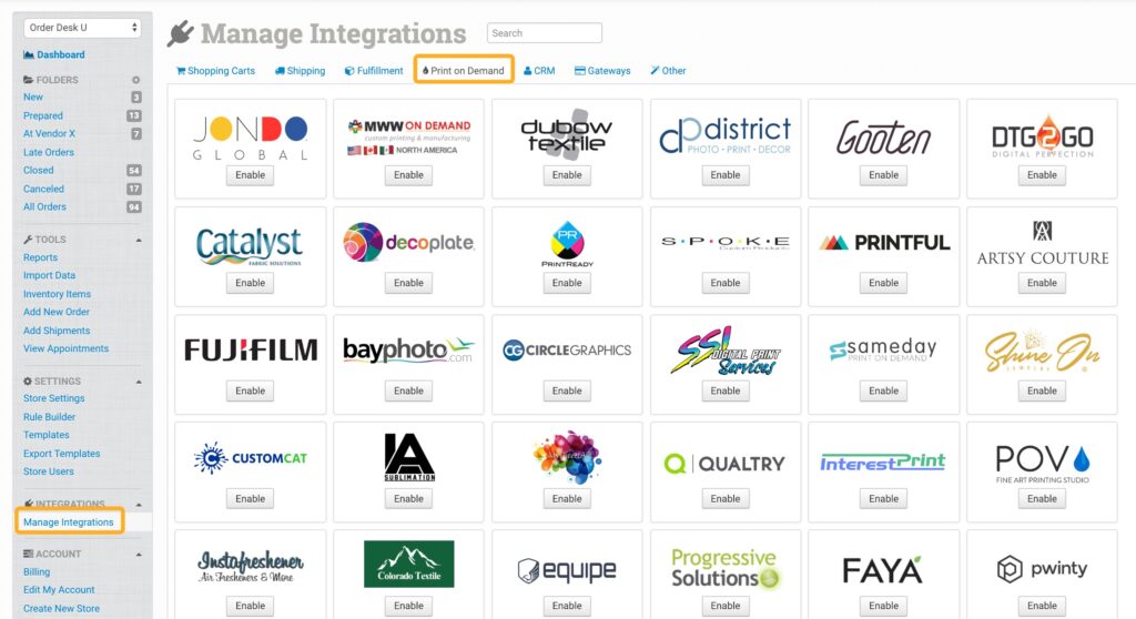 Enable your integrations from the Manage Integrations link in the left sidebar. You will find the print integrations under the Print on Demand tab.