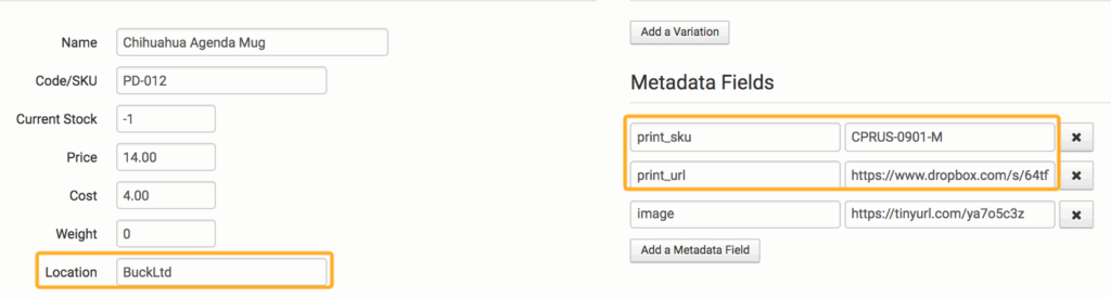The two variations you will be adding are the print_sku and the print_url, using the printer’s product code for the item and the link to your artwork file as the values.