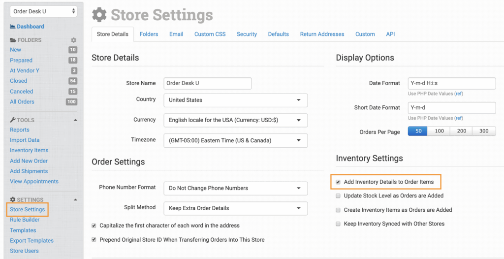 Click on Store Settings in the left sidebar. Under the Inventory Settings section, Add Inventory Details to Order Items should be checked.