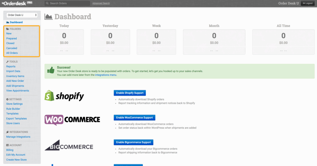 This first guide will give an overview of Order Desk, connecting integrations and working with folders. The second guide covers Orders and Inventory, and the third guide is about Customizing Order Desk.