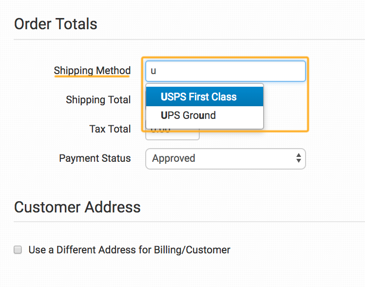 When adding information to a new or existing order, any fields you add to the Default Shipping Fields box will populate as you begin typing, allowing you to quickly select the field you need: