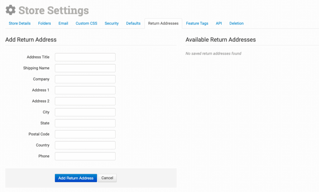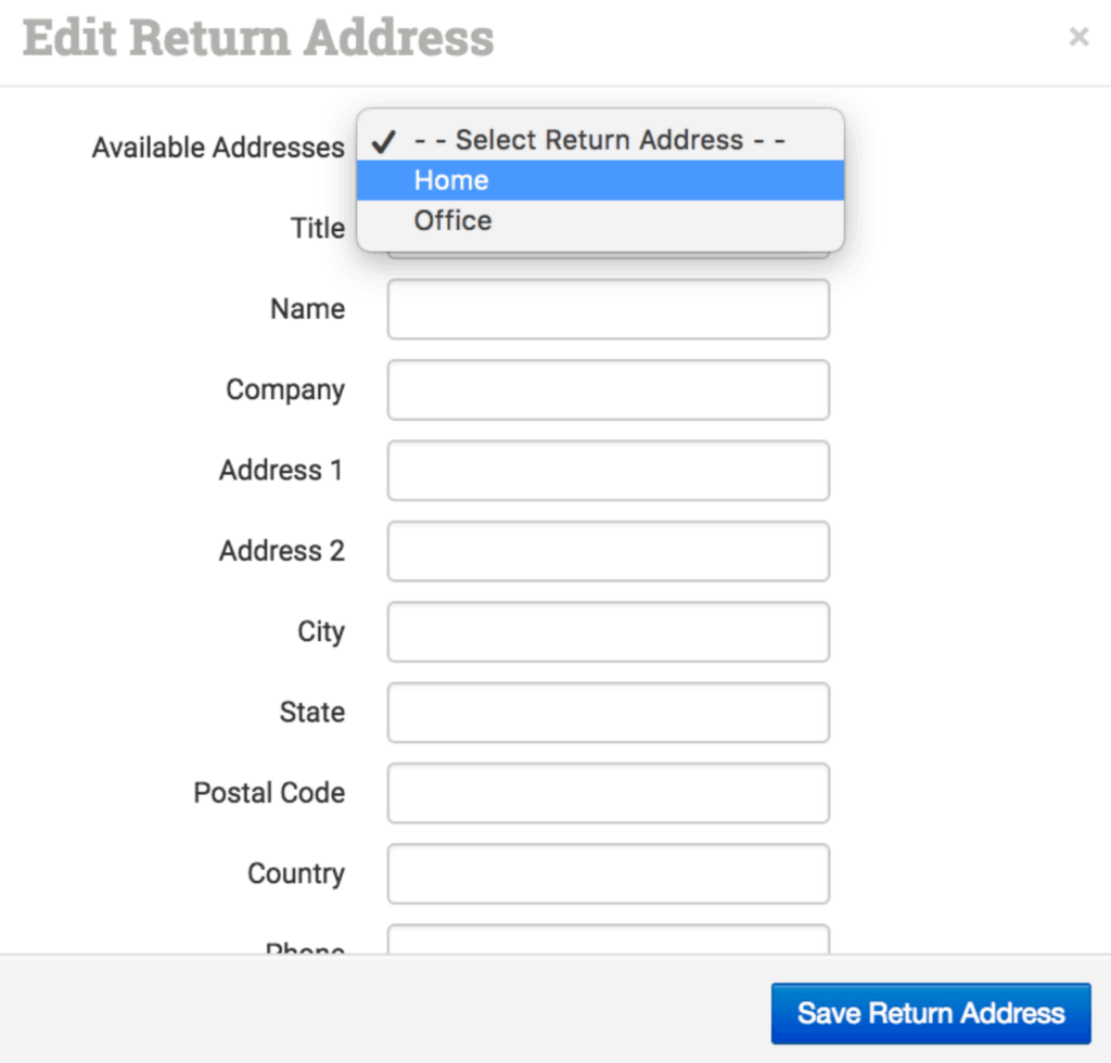 Add the return address you use for your store here. Add as many return addresses as you use, giving each a unique Address Title (Home, Office, Warehouse X, etc.).