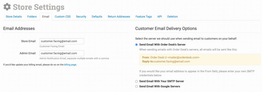 Email Delivery Options allows you to choose between sending email with Order Desk’s server, your own SMTP Server, or Google Servers. For more information, refer to our How to Send Email From Order Desk guide.