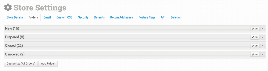 Folders in Order Desk act as a filtering and storage system for your orders. Each Order Desk store has four default folders; New, Prepared, Closed and Canceled. Folders can be rearranged, created and deleted to fit the needs of your workflow.