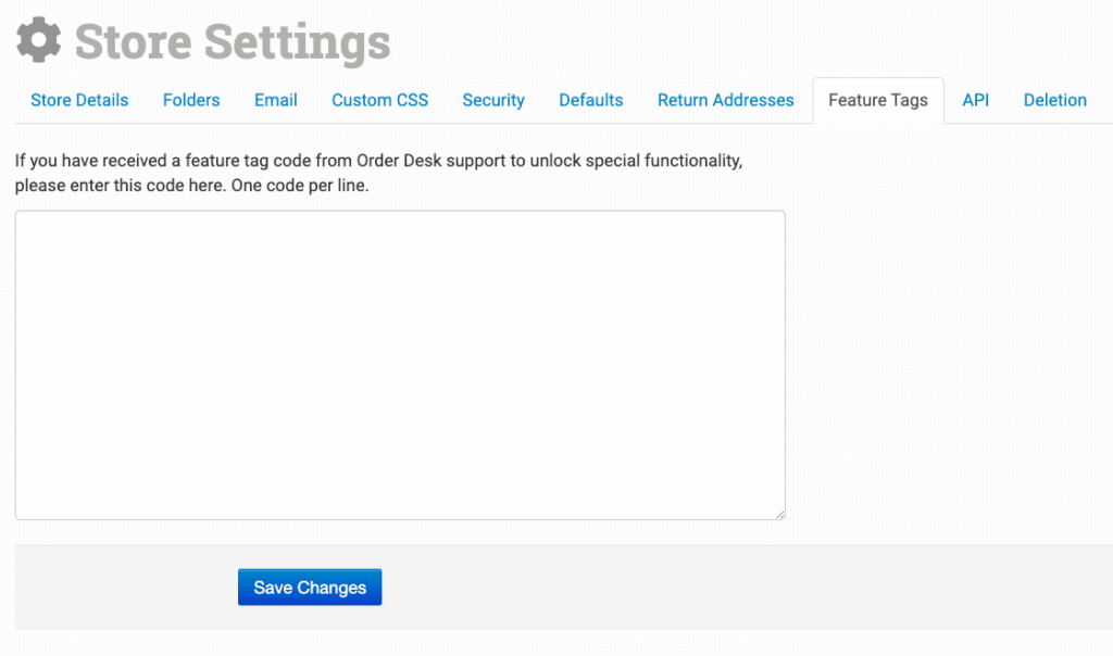 In some cases, Order Desk support may provide you with special feature tags to implement a custom feature for your specific store. In those cases, we will put the code in the box under this tab or tell you to enter it here.