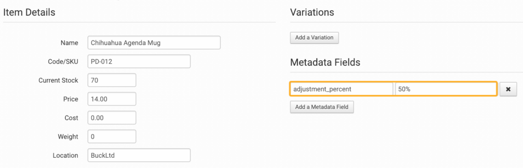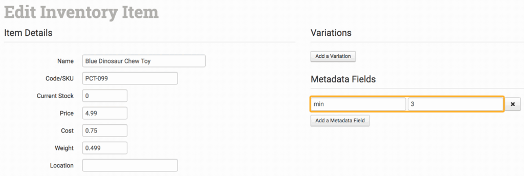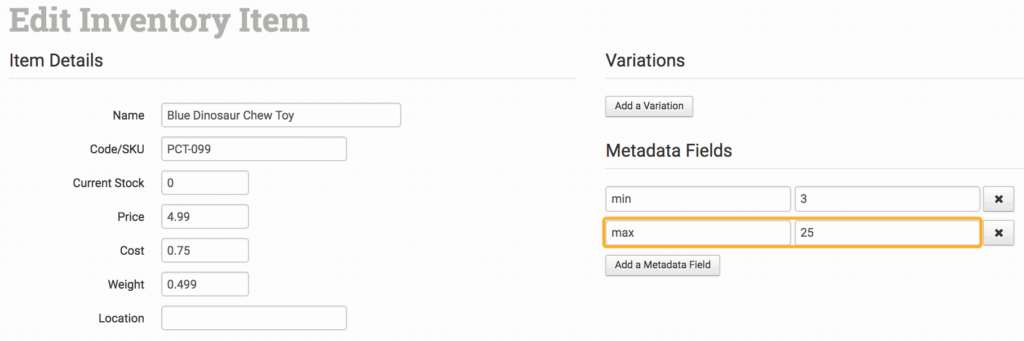 Another option is to set a minimum or maximum number of items available in your cart, regardless of the actual stock level. To do this, add min or max to the item metadata and set your preferred min or max number.