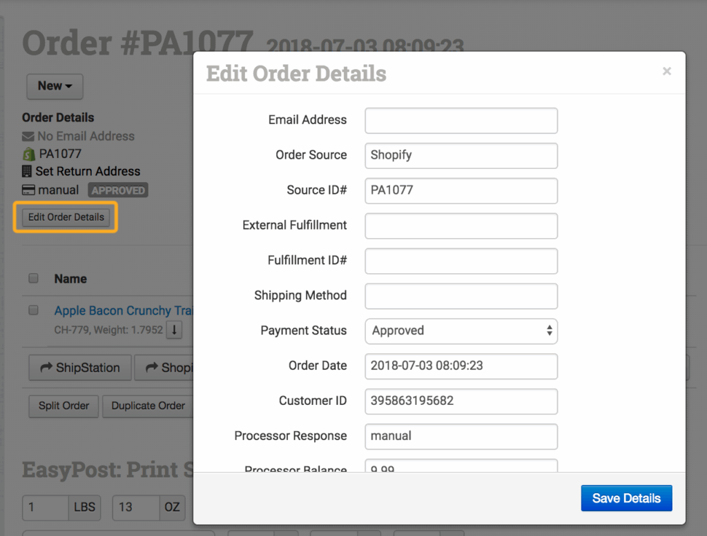 When any details are changed by clicking the Edit Order Details button: