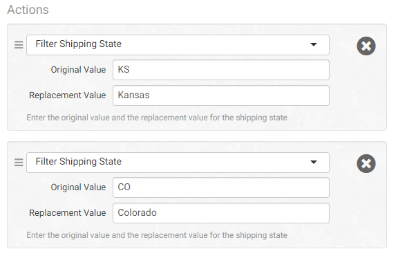 Changes the full state or region name to the 2 letter abbreviation. This only works for states and regions in US, CA, DE, AU, NZ and JP.