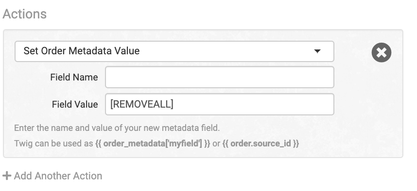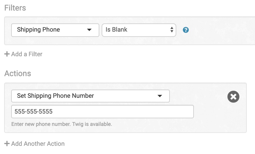 Add a tracking number and other shipment details to an order. Because this is a static field, this is best used for adding n/a to orders that won’t have a tracking number but need the Shipment is Added event to be triggered.